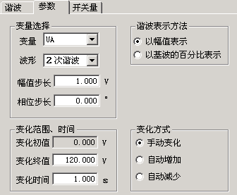 幅值步長(zhǎng):這里的步長(zhǎng)也與“諧波表示方法”相對(duì)應(yīng)。當(dāng)選擇“以幅值表示”時(shí),步長(zhǎng)也以幅值表示,單位是A或V;而選擇“以基波的百分比表示”時(shí),則步長(zhǎng)也是百分比。