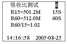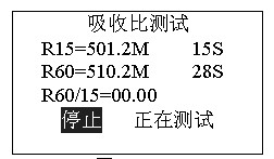正在測試,若想停止測試,按確認鍵停止測試。吸收比測試完畢后自動計算比值,進入是否保存提示。