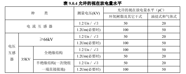5.局部放電測量的測量電壓及視在放電量應滿足表 9.0.4 中數據的規定。