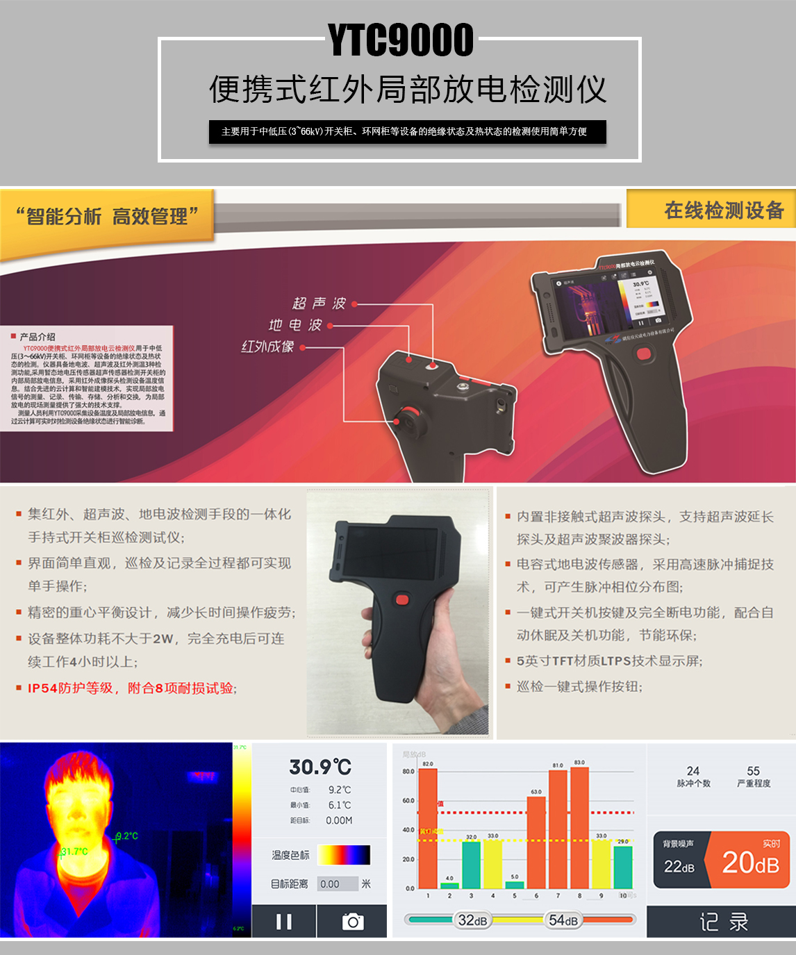 我司研發的YTC9000便攜式紅外局部放電檢測儀主要用于中低壓(3~66kV)開關柜、環網柜等設備的絕緣狀態及熱狀態的檢測,具備地電波、超聲波及紅外成像3種檢測手段智能評價局部放電狀態, 顯示紅綠燈報警、支持單機、聯網 兩種工作模式,使用簡單方便功能強大。